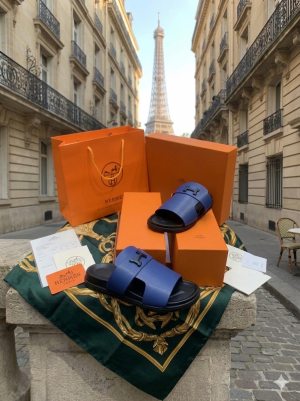 HERMES LOGO BLUE PREMIUM LEATHER SLIDE